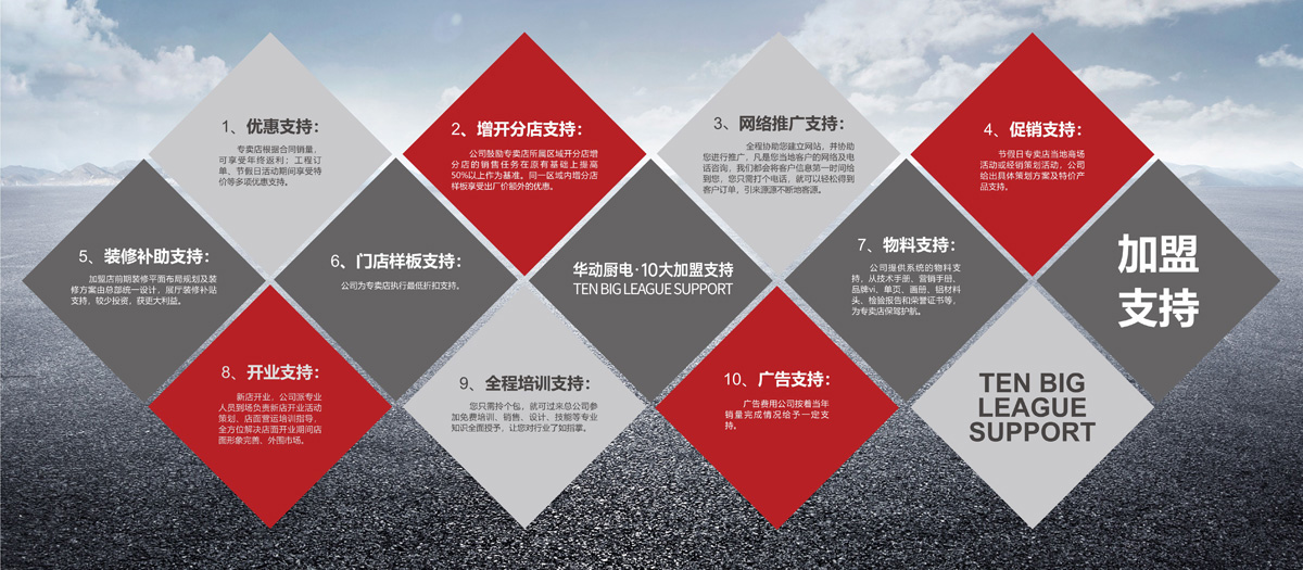 針對加盟店正式營業(yè),公司將提供相關(guān)完善推廣物料支持,沿產(chǎn)品四周以串吊旗圍繞,墻壁顯眼位置擺放央視4大頻道投播品牌,200家權(quán)威媒體報(bào)道,視頻媒體投播,7大搜索引擎?zhèn)鞑?,在門口位置擺放立宣傳易拉寶等宣傳物料支持,開業(yè)前公司將提供店面裝修的整體設(shè)計(jì)方案、實(shí)物視頻、產(chǎn)品文化、戶型建模展示等支持,同時(shí)到開業(yè)現(xiàn)場指導(dǎo)。